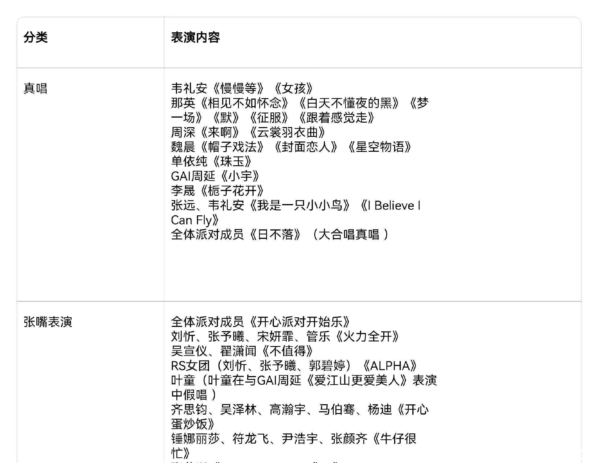 她采纳的歌曲涵盖了她三十多年行状生活的精华。在《校服》中,不错感受到她对豪情的执着与释然;而《默》则传递出一种深重的孤苦之感;《随着嗅觉走》则让东说念主感受到一种目田的心理。诚然一些乐评东说念主士提到她的演唱中出现了气短和高音受阻的技艺问题,但大多量不雅众依旧被她的豪情深度所感动,尤其是在《白昼不懂夜的黑》的演绎中,她的声息把孤苦的豪情抒发得长篇大论。
