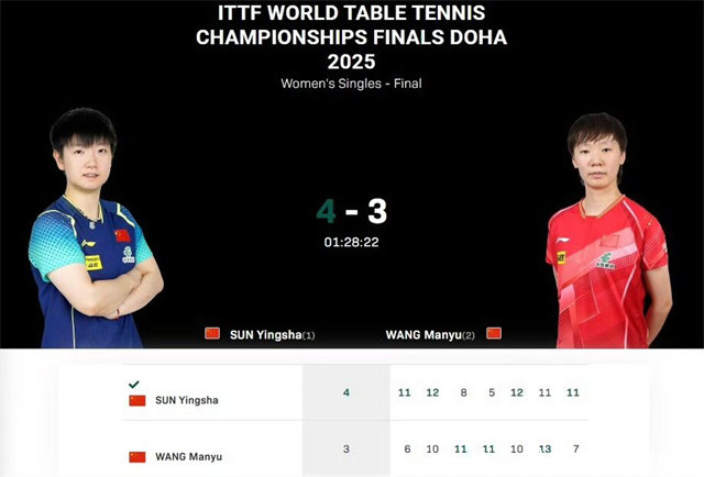 多哈世乒赛女单决赛亚洲博彩,孙颖莎4-3征服王曼昱 ,卫冕世乒赛女单冠军,七局比分:11-6、12-10、8-11、5-11、12-10、11-13、11-7。