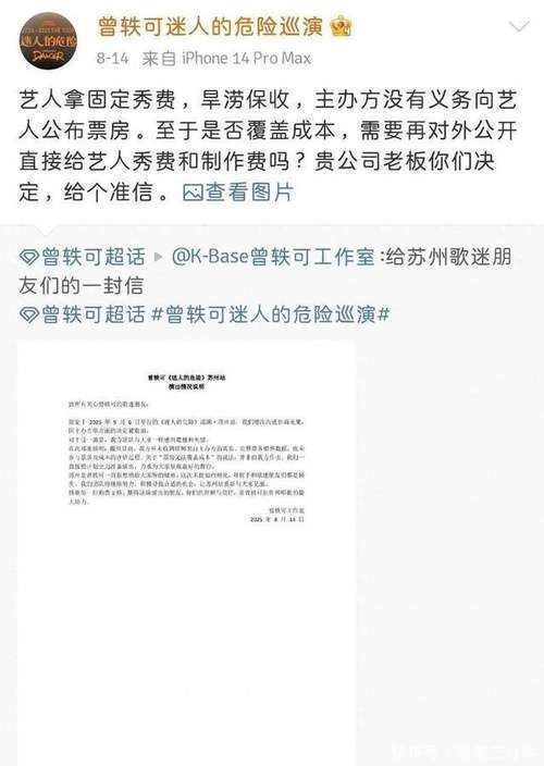 9月6日,杭州葫芦狗文化发展有限公司一纸公告,通知取消原定于同日在苏州举行的曾轶可“迷东说念主的危境”巡演。公告措辞平直,坦言“票房远远无法粉饰献技资本”,这看似肤浅的声明,却如同导火索,燃烧了主持方与曾轶可责任室之间的矛盾。